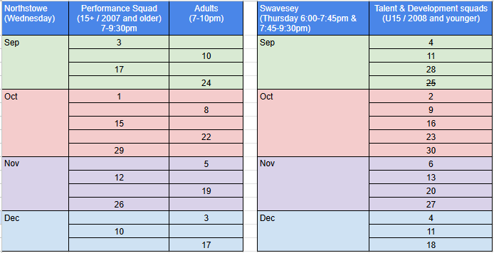 Wednesday evenings from 7-9.30pm at Northstowe Secondary College, Stirling Road, Northstowe, CB24 1DJ: These sessions are for the Performance Squad (generally birth year 2007 and older)