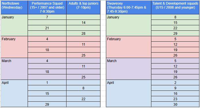 The County currently runs regular training sessions for the senior and masters squads. These sessions are held every other Wednesday evening from 7-10pm at Northstowe Secondary College, Stirling Road, Northstowe, CB24 1DJ on the following dates: